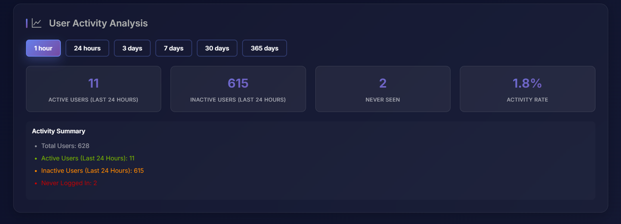 - Activity Tracking 📈 – Analyzes user engagement and retention across multiple timeframes (from 1h to 365 days)