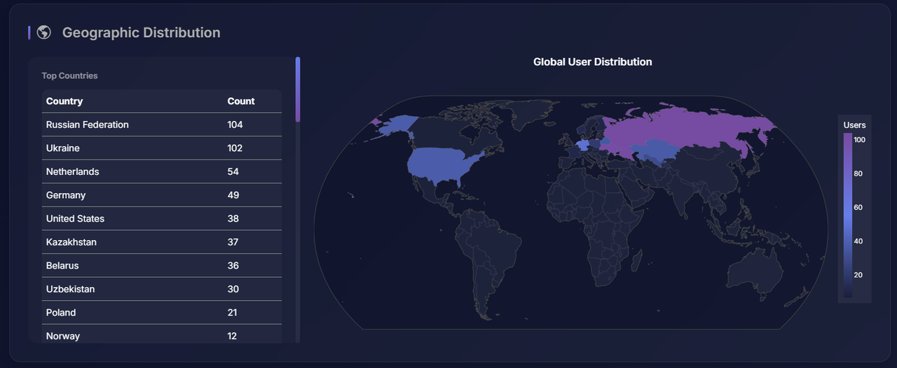 - Interactive Geolocation 🌍 – Visualizes user distribution across the globe using an interactive heat map