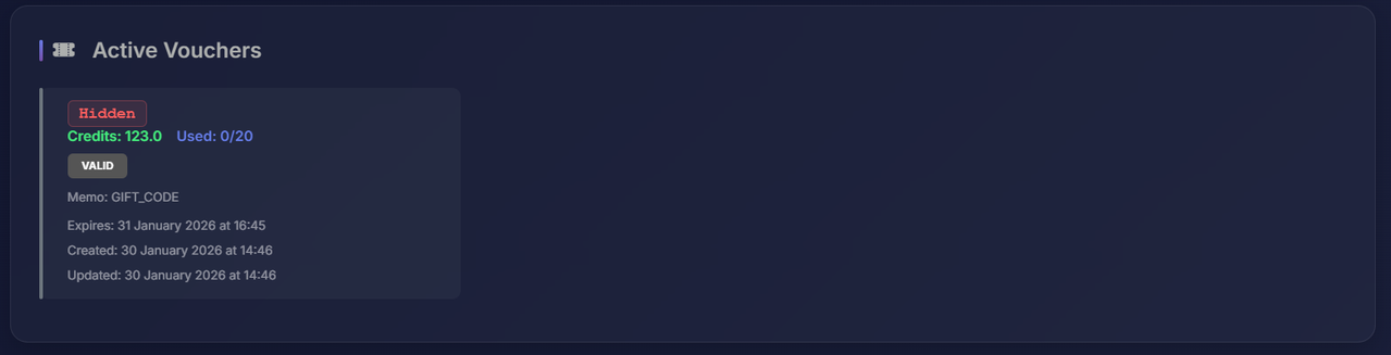 - Voucher Management 🎫 – Monitors active discount codes, credit balances, and usage statistics at a glance