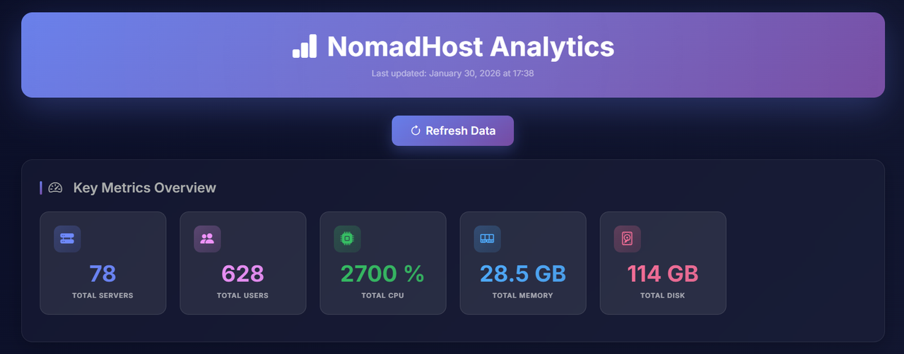- Real-time Analytics 📊 – Provides a comprehensive overview of your hosting’s key metrics and infrastructure health