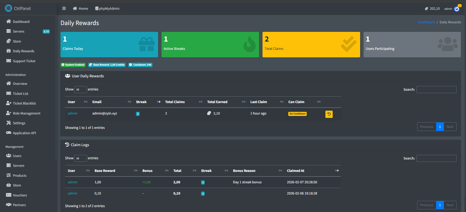 By offering daily rewards you ensure your users return to your dashboard regularly keeping your community active and your hosting economy flowing.