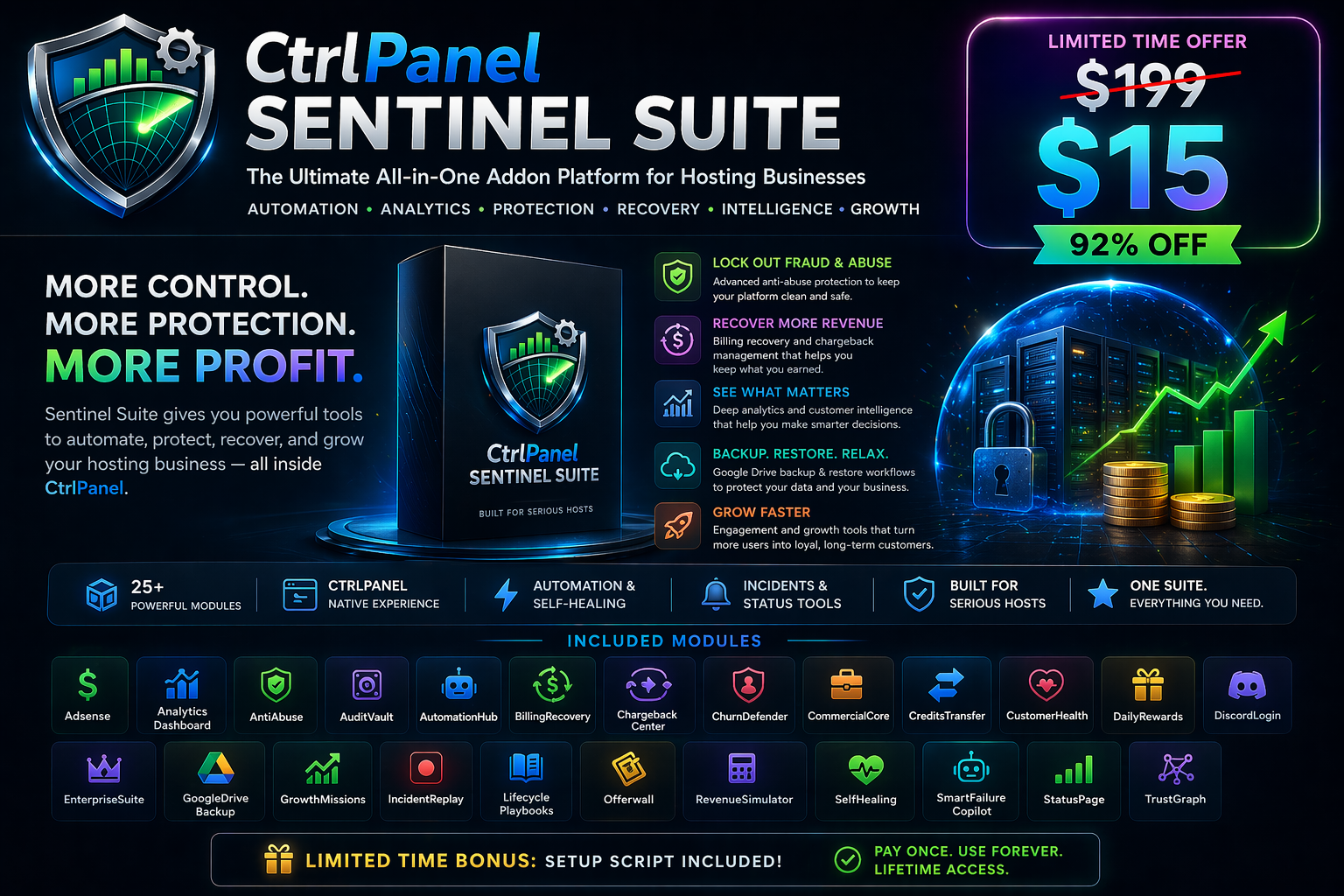 CtrlPanel Sentinel Suite is a premium all-in-one addon pack built for hosting providers who need more than the standard CtrlPanel setup.
